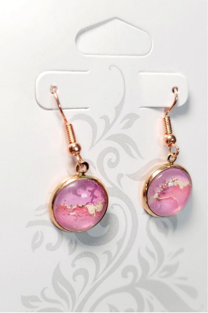 Hand crafted artisan dangle drop earrings with a pink and gold marble effect on a rose gold colored earring beveled tray . Measures 1".
