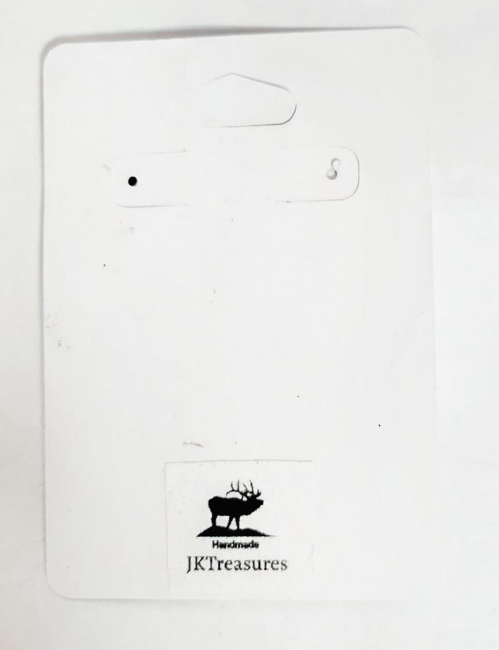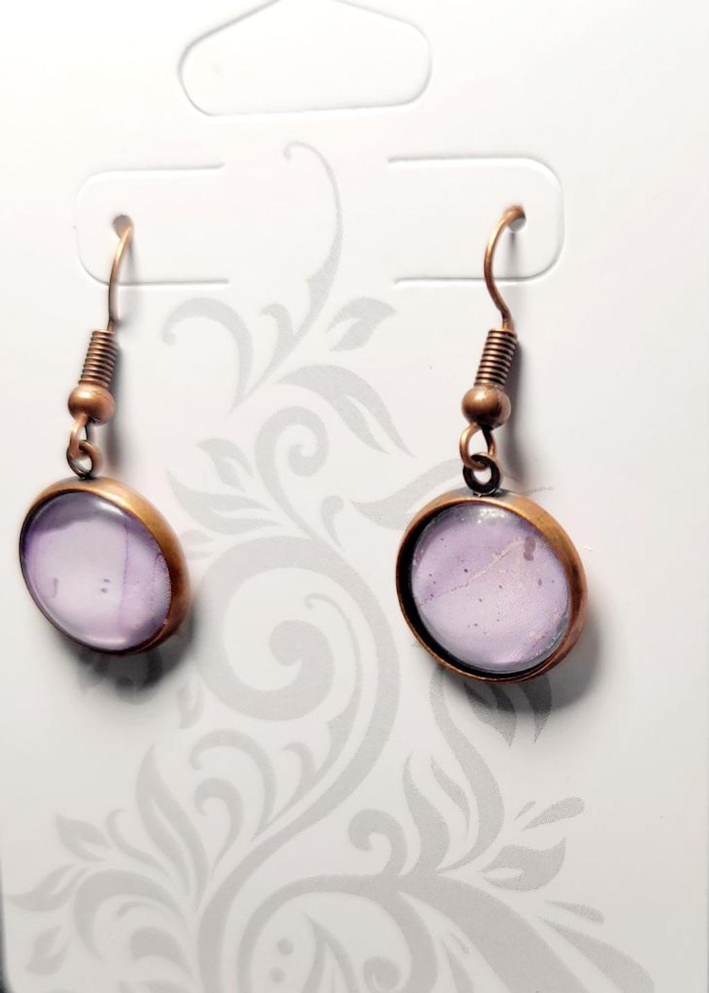 Hand crafted artisan dangle drop earrings with a light purple and gold marble effect, set in a copper colored earring bezel tray. Measures 1".