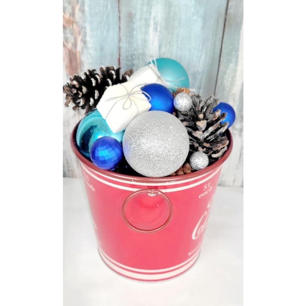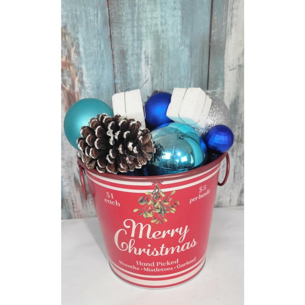 This is a new, unused Ashland Christmas decorative container. It is a red metal bucket with a white rim. The bucket is approximately 6 inches tall and 5 inches in diameter. It features a printed design that says "Merry Christmas" and "Hand Picked Wreaths - Mistletoes - Garland." The bucket is handcrafted with various blue and silver shatterproof Christmas ornaments and white presents, as well as pine cones. The bucket is in perfect condition and comes with its original tags. It would make a perfect table centerpiece during the holiday season