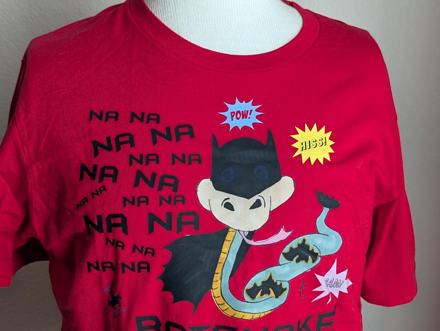 This exclusive design features my original art showing a snake dressed as a popular superhero. It is sure to be a hit with fans of superheroes, snakes, and/or unique designs! Our logo is featured on the back of the shirt.