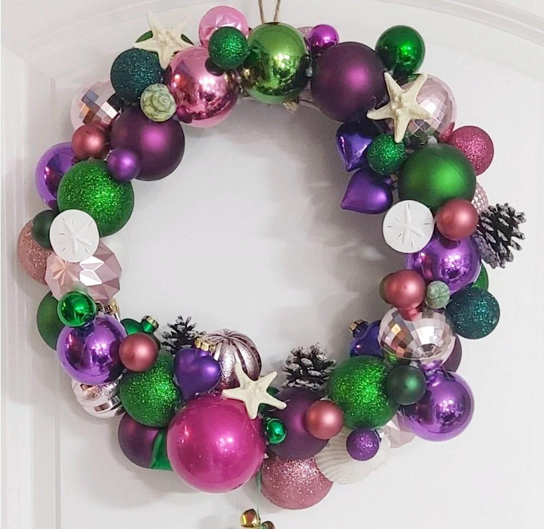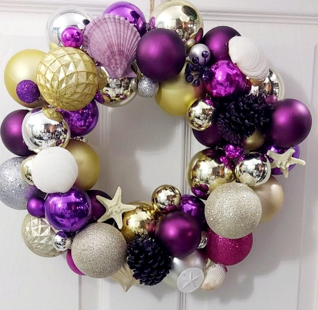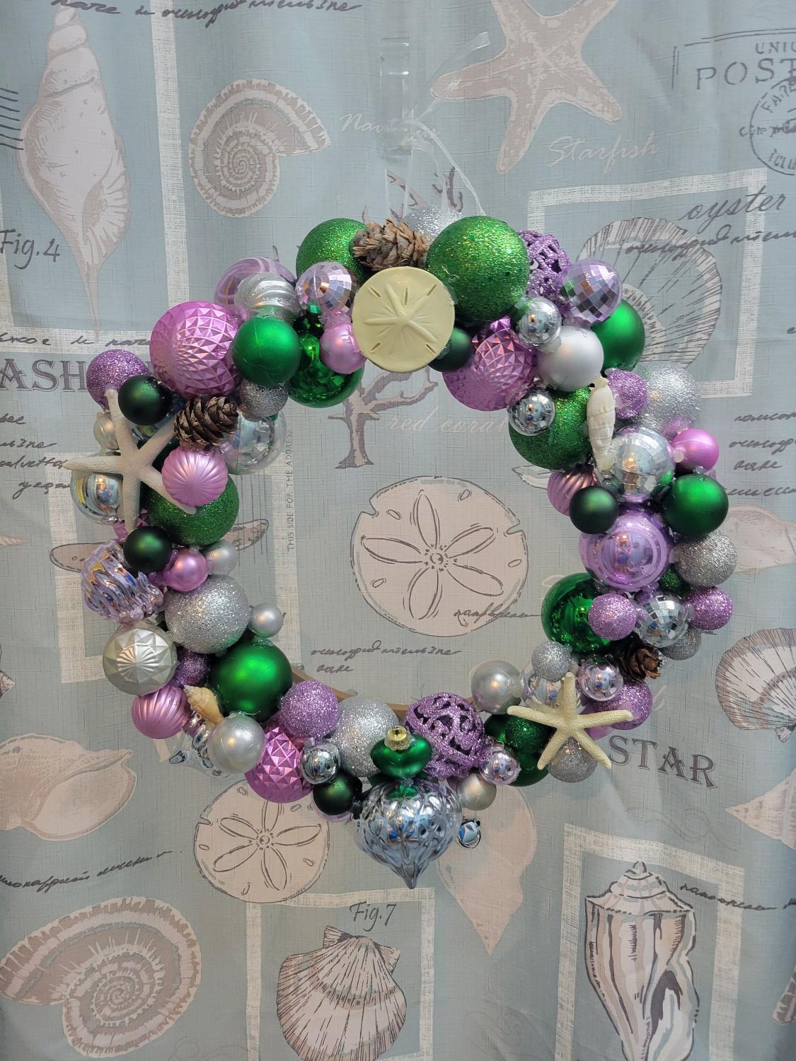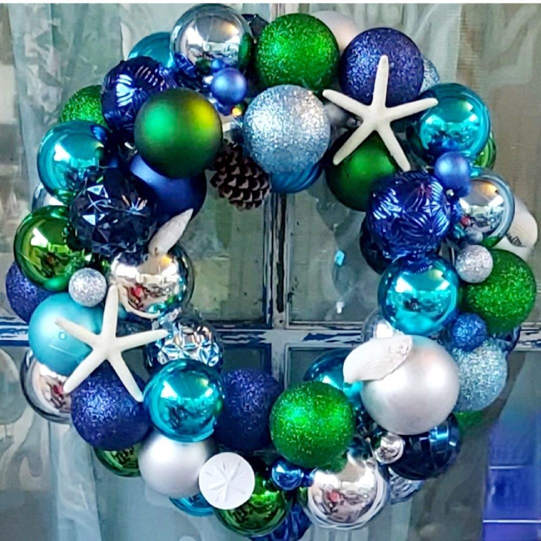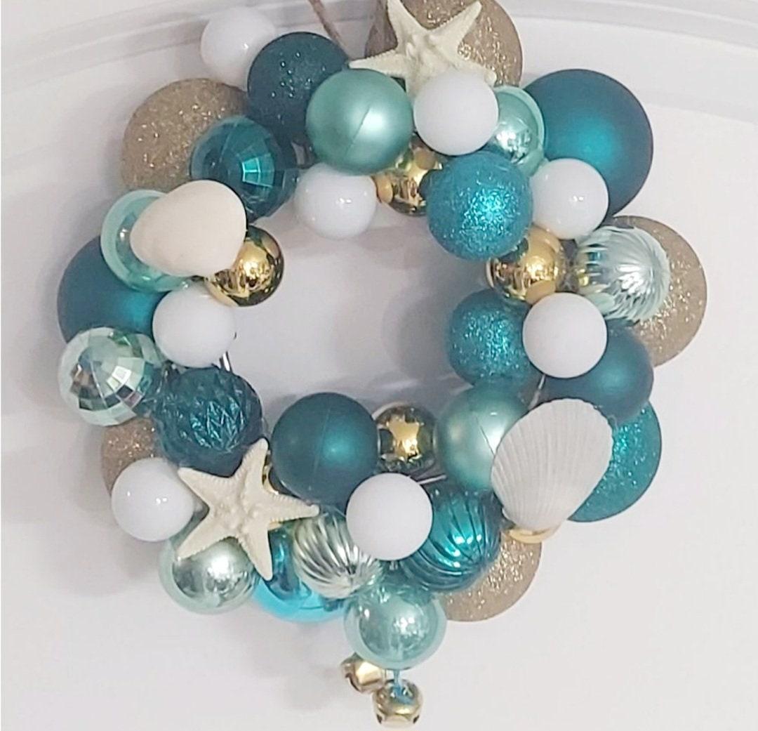 Beach Coastal Christmas Winter wreath with shatterproof ball ornaments Nautical beach theme