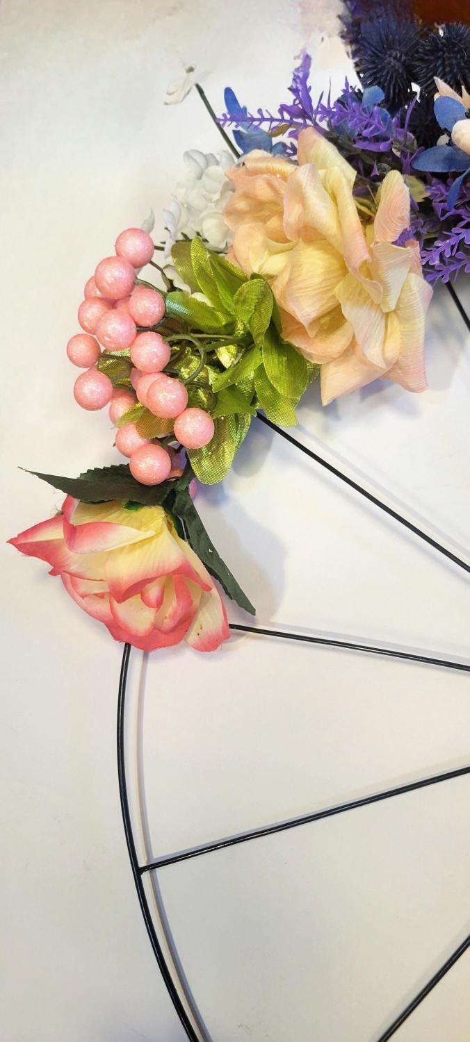 Handmade 14-inch bicycle wheel wreath decorated with artificial flowers of roses, peonies, sprigs, berries, greenery, and more, hung from a twine rope. All purchases are wrapped with care and a handwritten thank you card included. Gift wrapping is available upon request. #Wreath #FarmhouseDecor #WallDecor #BicycleDecor