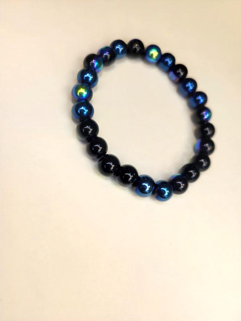 Handmade black Aurora Borealis glass beaded bracelet on a stretchy cord. Fits up to a 6.5" wrist best. No spacers needed as the shimmering colors change with the light.