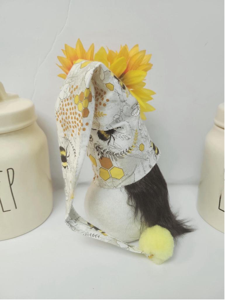 Meet Sunwing Bumblewhistle, the lively gnome with a sunflower crown and studies bees and vibrant gardens. Sunwing is handmade with love, made with premium materials, filled with rice and poly-fil for stability, a bumble bee printed hat, with sunflowers attached, with a yellow pom pom tip, wooden nose, and flowing luxurious black faux fur beard. He stands approximately 7" tall and 19" tall to the tip of his hat. Sunwing would make the perfect addition to your Rae Dunn Collection or tier tray decor. Jars not included.