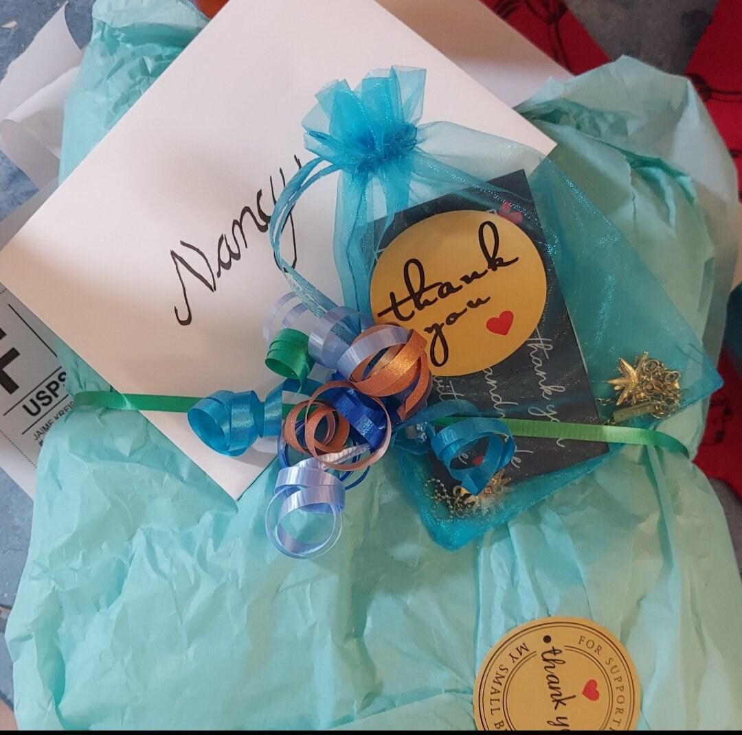 Handmade 14" bicycle wheel with screen attached to the back and artificial purple daisy like flowers attached to the front, and a twine cord to display it by to hang your earrings from. All orders are wrapped with care and a handwritten thank you card included.