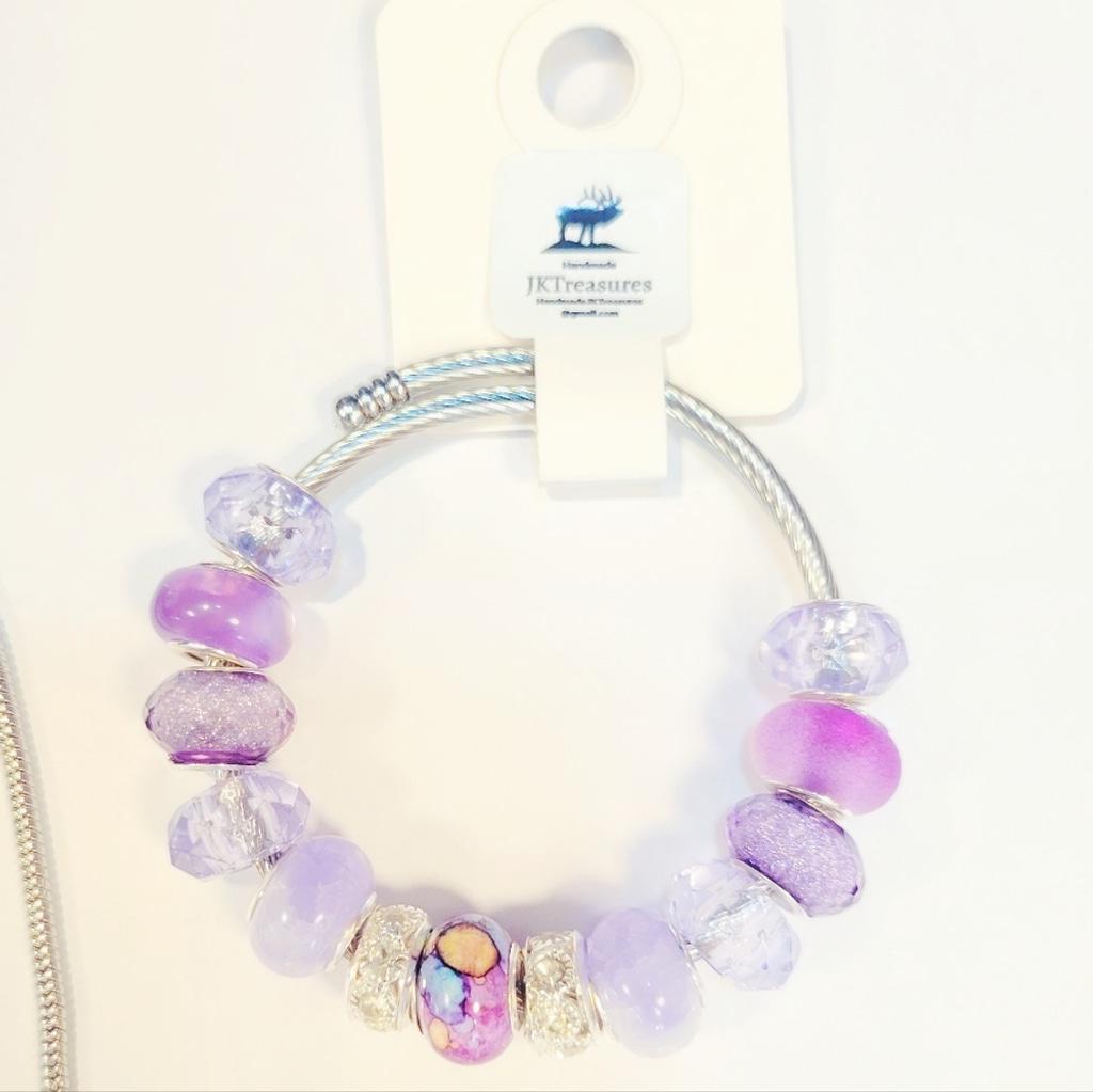 Handmade beaded 7" adjustable snake coil bracelet. The beads are made from brass, resin, and glass. The bracelet also comes with a second snake coil chain, with a 2" adjustable clasp and a heart charm. Simply twist the end off to customize your bracelet at home. This elegant charm bracelet features a stunning combination of purple hues, perfect for adding a touch of sophistication to any outfit. The intricate design and vibrant colors make it a must-have accessory. #Europeanstylebeads #beadedbracelet #snakecoilbracelets