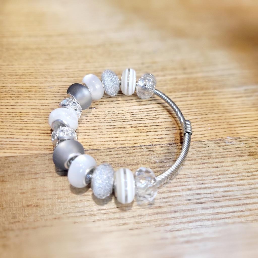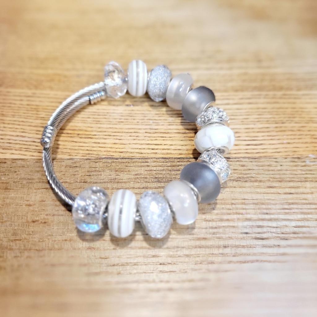 This elegant artisanal bracelet features a stunning combination of large hole silver and white beads, on an expandable 7" snake coil silver bracelet, perfect for any occasion. Its sophisticated design adds a touch of class to your outfit. The beads are made from brass, resin, and glass.