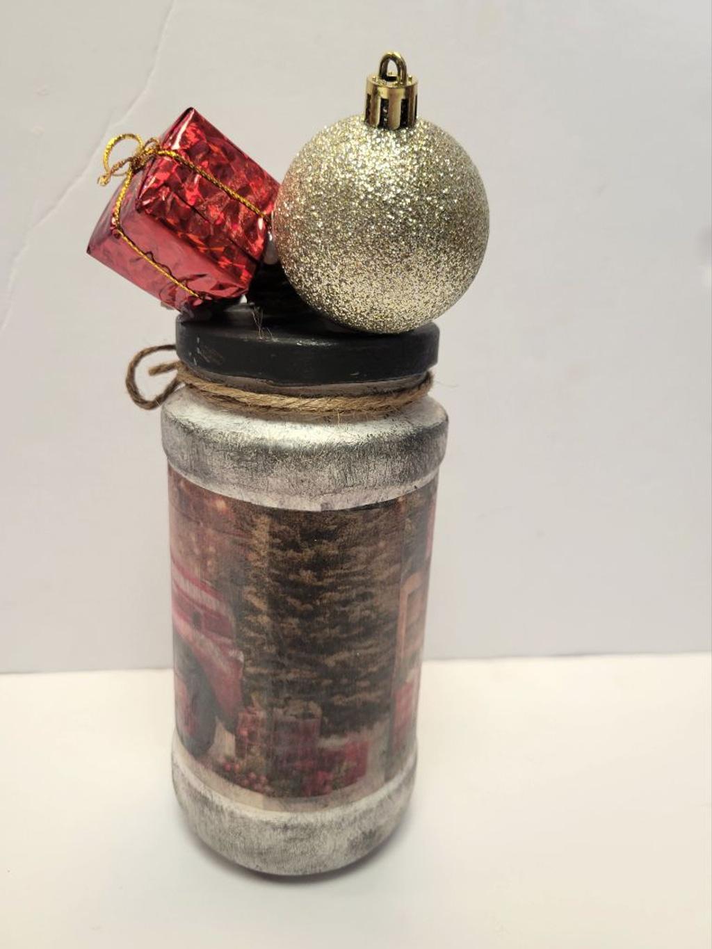 Handmade lidded glass jar that's been distressed and an applique added of the old red rustic farmhouse truck in a Christmas scene, and mini frosted pinecones, presents, and ornaments added, with a twine bow in front. **Truck not included ** #Farmhouse #rustic #farmhousetruck #handmade #christmasdecor