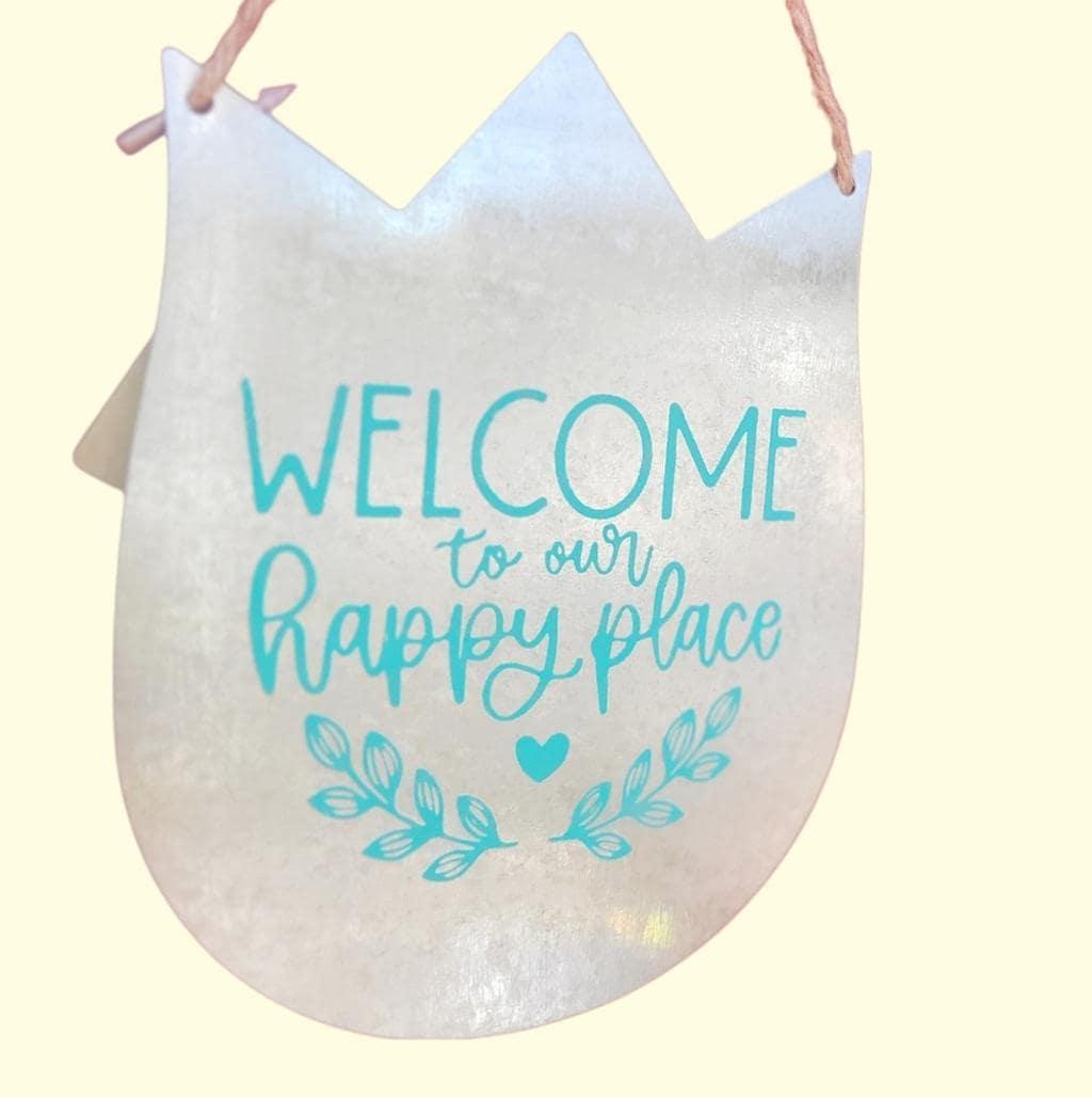 This charming silver galvanized steel tulip sign has been hand crafted with blue lettering "Welcome to our Happy Place.", with a twine rope. Perfect for home decor, on the front door, in your garden, or patio. Measurements are approximately 8" tall by 6.5" wide, and 14" twine.