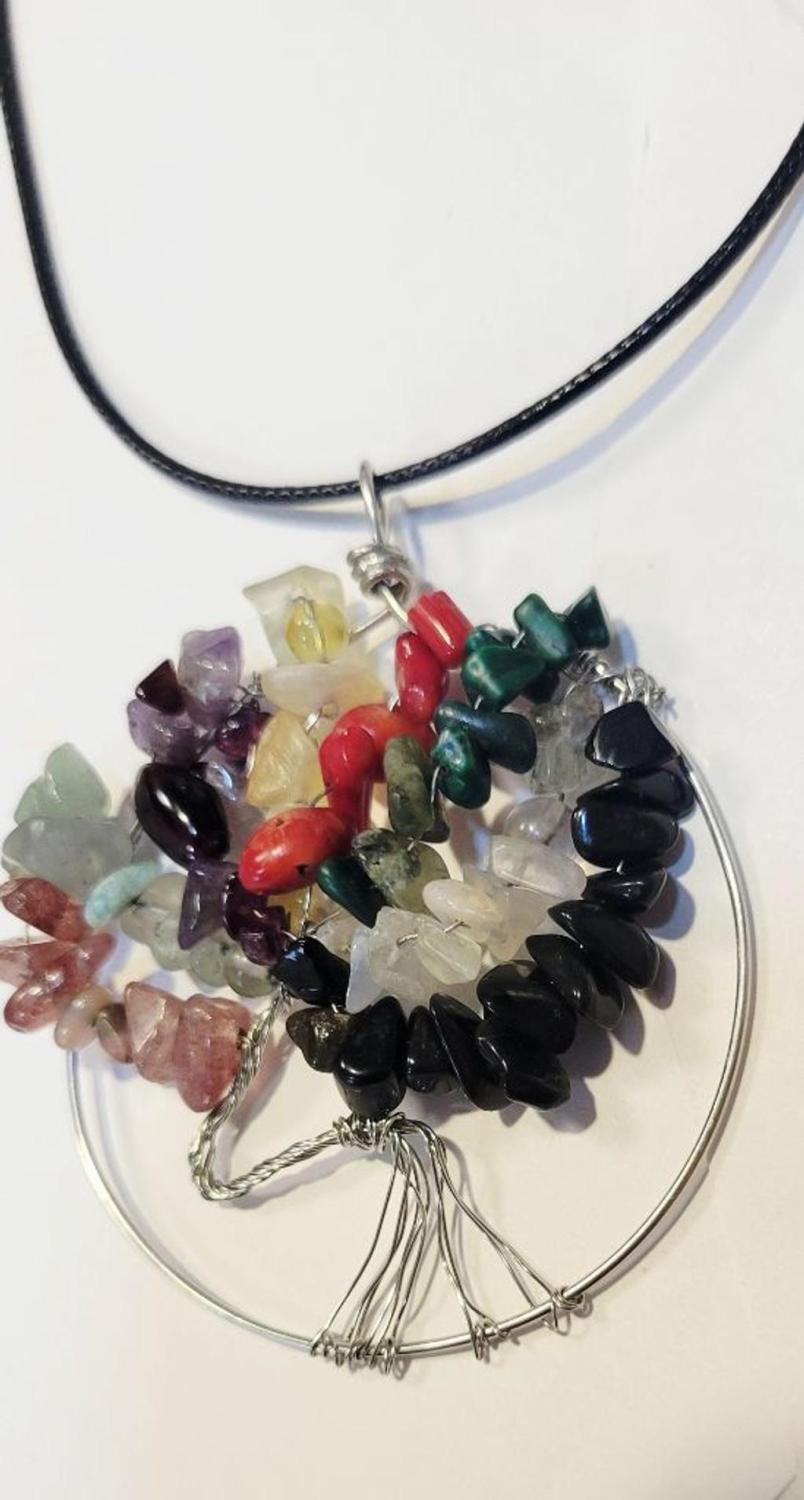 Handmade tree of life necklace made of wire, hand-shaped circular base, with wires wrapped to form the trunk, and then spread out to create heavy foliage on each individual branch with natural gemstones. The pendant measures approximately 3" and is hung on a 16" corded adjustable necklace.