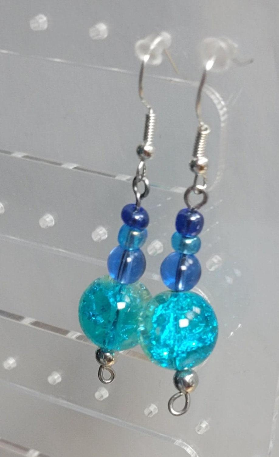 Handmade glass bead hook drop earrings in blues and greens and silver hook, measures approximately 1.5"
