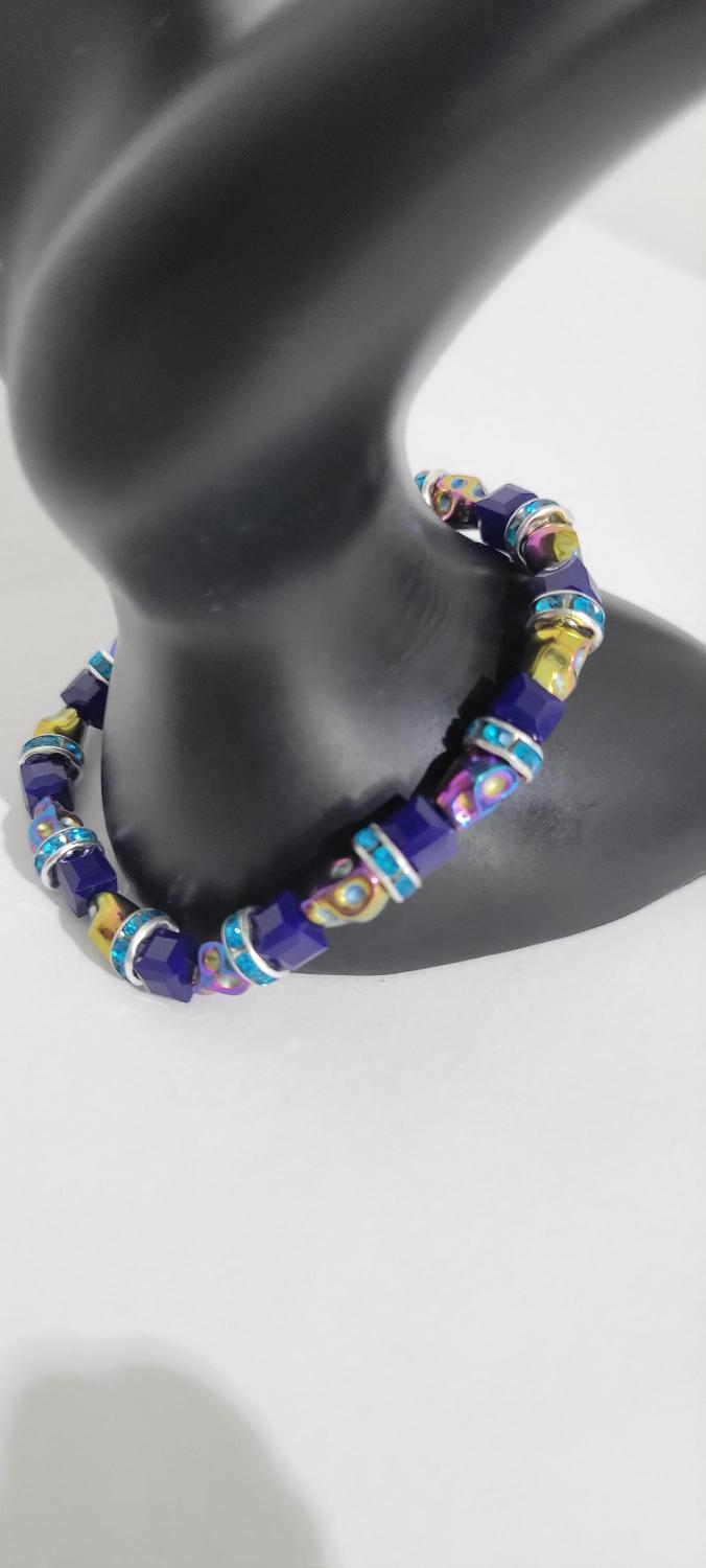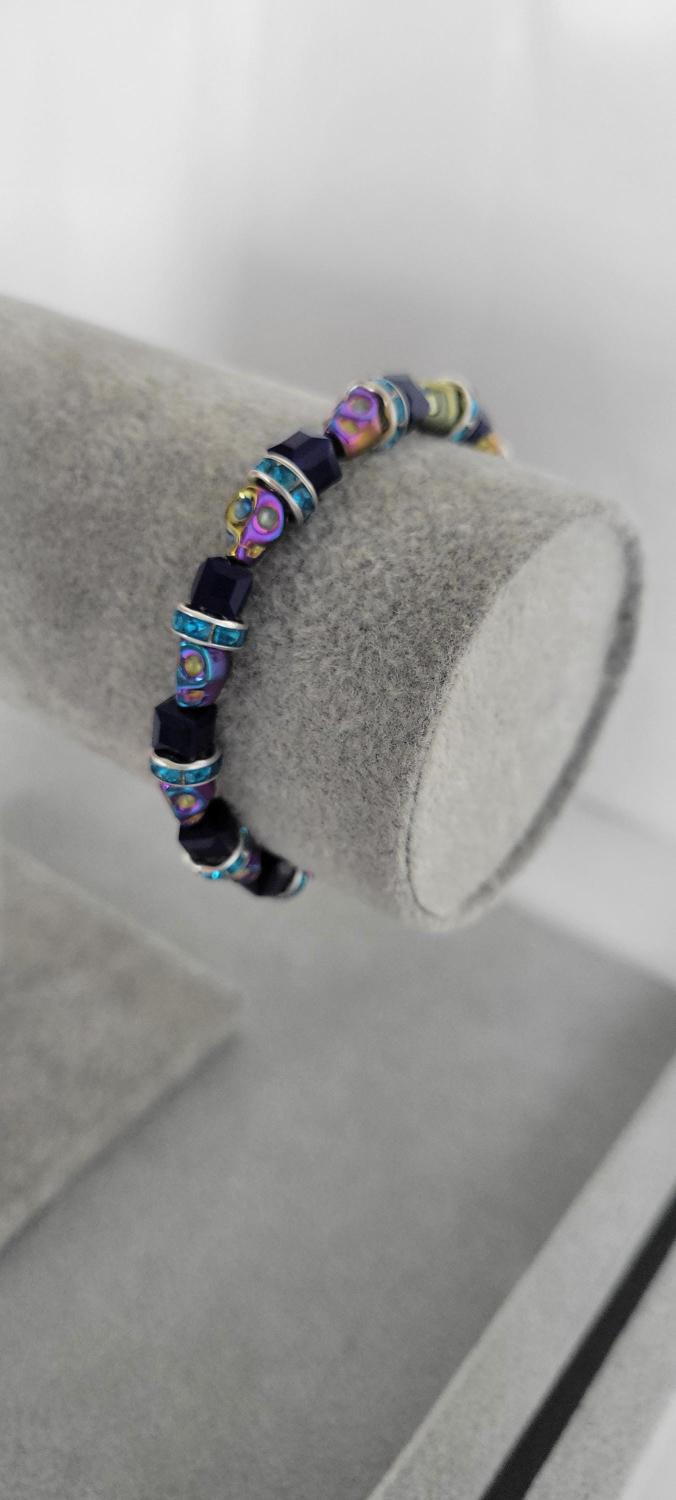 Hand crafted bracelet with iridescent skulls, dark blue glass beads, and blue rhinestone spacers, with a stretchy cord. Measurements are approximately 7".