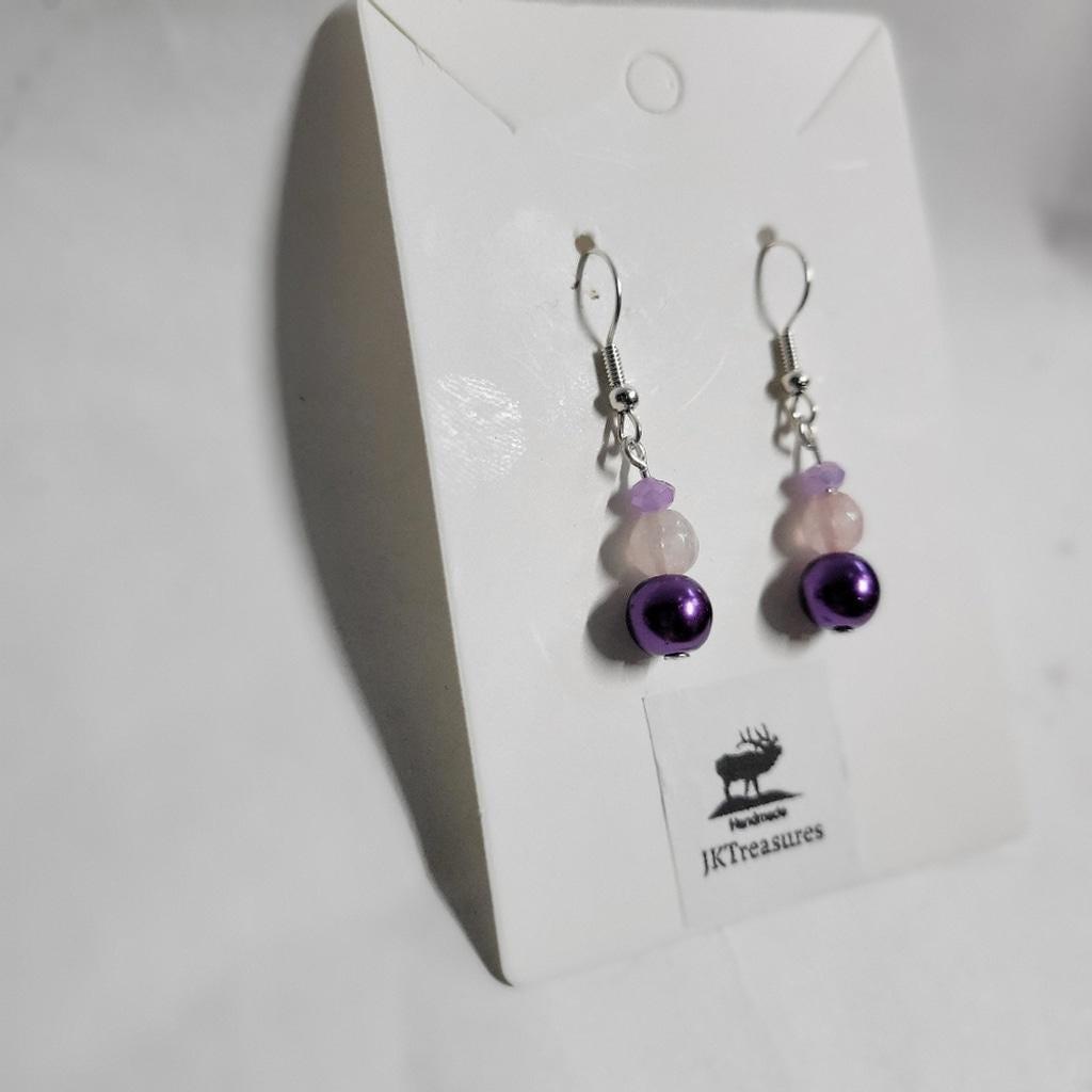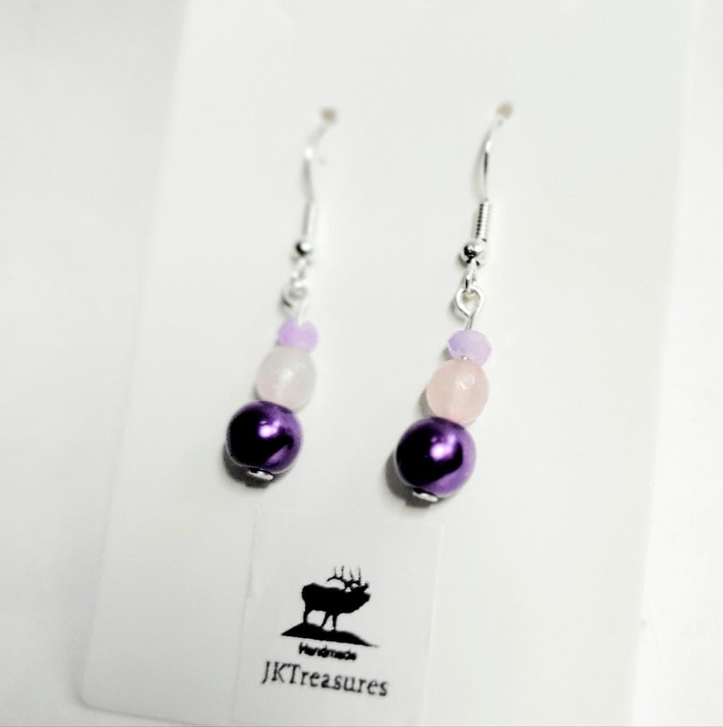 Hand crafted 3-4 mm lilac faceted beads, with 5-6 mm rose quartz crystal beads and 8 mm purple glass bead dangle earrings with a wire hook. Measures approximately 1/2".