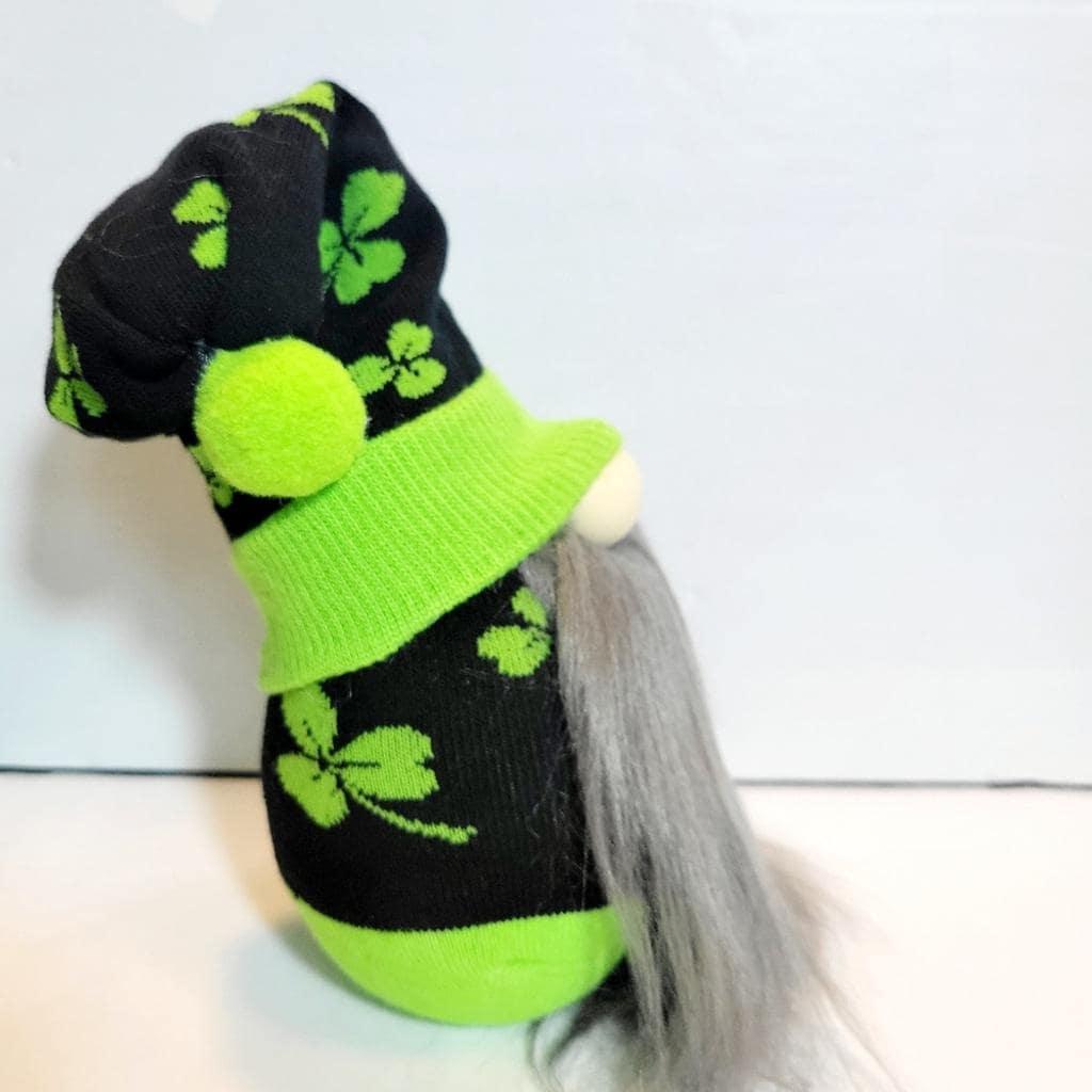 Hand crafted St Patrick's Day Leprechaun gnome made from a black with lucky green 4 leaf clovers, weighted with rice, brown button nose, long, gray, flowing beard, with matching hat, topped off with a green pom pom. He measures approximately 7" tall.