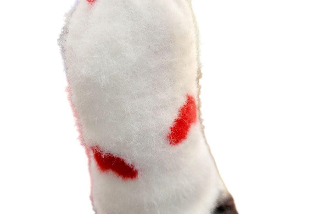Hand crafted Valentine's Day sock gnome, made with a soft and fuzzy body and hat in white, with red hearts, rice, weights, and filler, and his hat is adorned with a sparkly white pompom. He has dangly arms and legs, holding a sparkly red heart, with purple boots and mittens. He measures approximately 13" tall.
