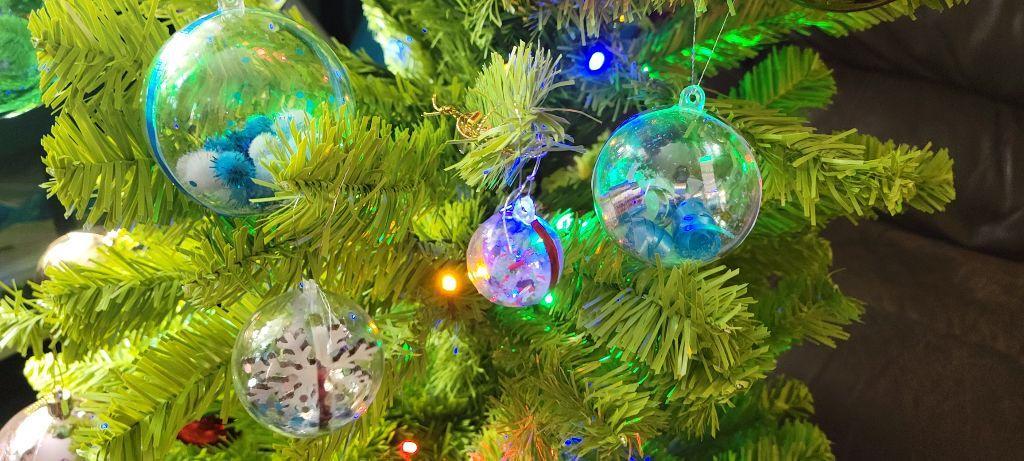 Handmade decorative clear ball Christmas ornaments made with blue and white pom poms, faux snow, different colored ribbons, and Christmas inclusions, which includes candy canes, candy, trees, snowmen, stockings, glitter, and more. Each ornament is sealed and wrapped with ribbon. The 3x 3" ornaments have spiraled silver hooks, and the 4x 2.5, 4x 2, & 4x 1" have silver threads.