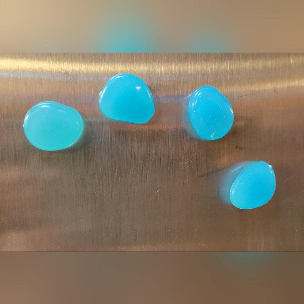 Handmade set of 4 phosphorescent glow in the dark rock magnents. Activated by light and strongest by u.v. light. Each stone measures approximately 1".