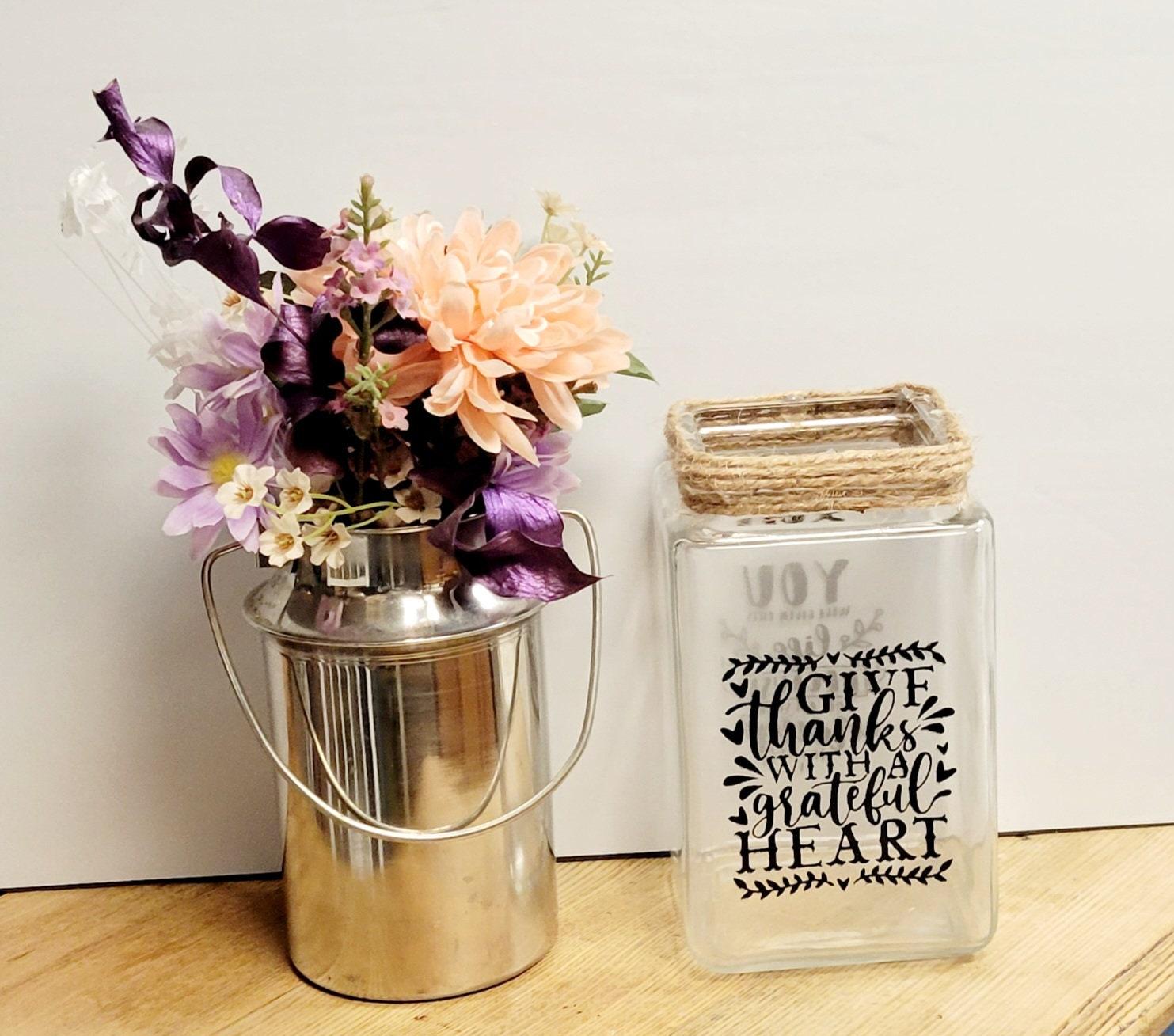 Handpainted rustic farmhouse style square jar measuring approximately 7.75x3.75", with twine wrapped around the glass neck, and the sayings, "Give thanks with a grateful heart" and "You are given this life because you are strong enough to live it".