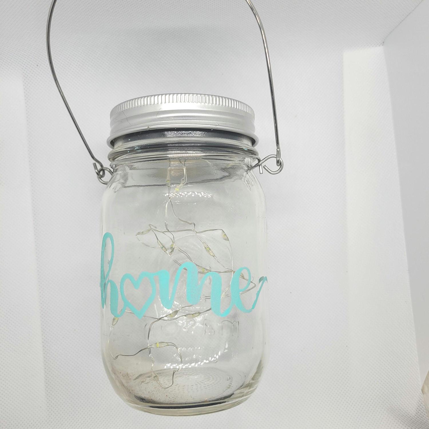 Handpainted with HOME on a medium, 4", mason jar with solar led fairy lights and a handle to hang it from a hook.