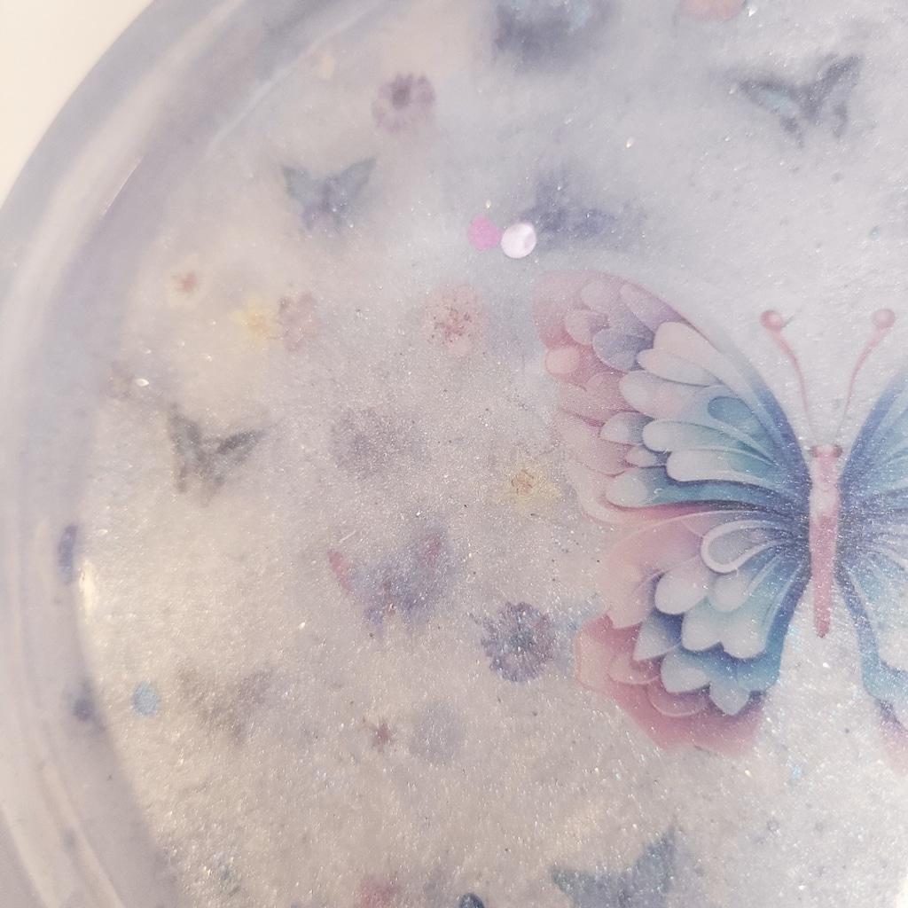 Beautiful iridescent resin trinket dish with butterfly accents. Perfect for adding a touch of elegance to any room. Handcrafted 4" resin trinket tray made with 1 large vinyl butterfly and multiple multicolored acrylic butterflies, flowers, purple mica powder, and glitter.