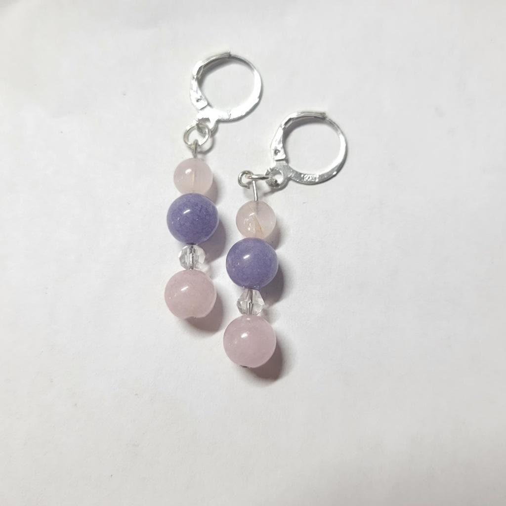 Handmade natural 2 mm Crystal Rose Quartz, 8 mm Angelite, and Morganite beaded drop earrings on a 925 stamped sterling silver lever back hook. Measures approximately 1.25".