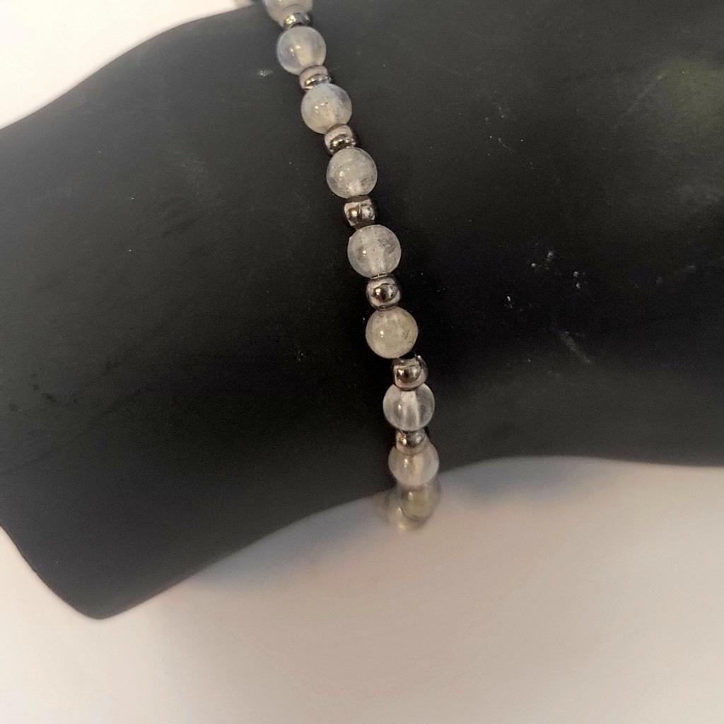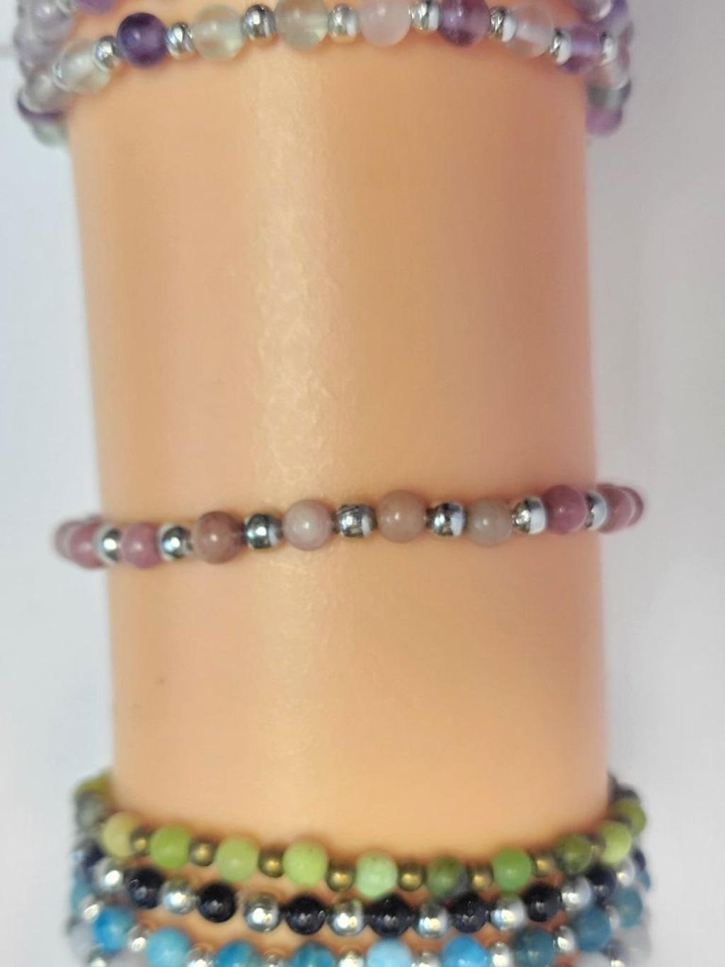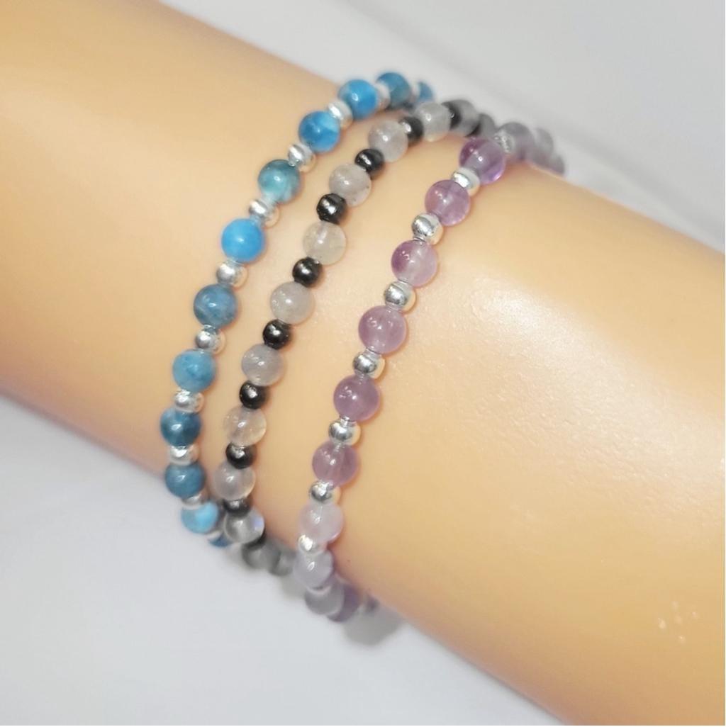 Handmade natural gemstone 4mm dainty beaded bracelets in amethyst, gray moonstone, blue apatite, Tiger's eye, Golden Obsidian, Blue Sandstone, Flourite, Aquamarine, Rhodonite, Austrian Jade, Selenite, Purple Dragon Vein, mixed gemstone. Measurements are approximately between 6.25-7". The bracelets can be bought separately, or buy 2 save $5, buy 3 save $10. Bundle to save. Amethyst protects against negative energy, stress, & bad habits. Helps with anxiety, insomnia, & headaches. Gray moonstone often called the "New Moon Stone", believed to bring about potential, perceive beyond the veil, & work with unseen realms. Blue apatite enhances communication, intuition, & motivation. Blue sandstone associated with love, hope, & commitment. Rhodonite promotes self-love & heals emotional wounds. Aquamarine courage, emotional clarity, & calm Tiger eye courage, strength, grounding Obsidian grounding, protection, energy clearing Australian jade helps emotional healing Flourite promotes mental/emotional clarity, balance, & focus