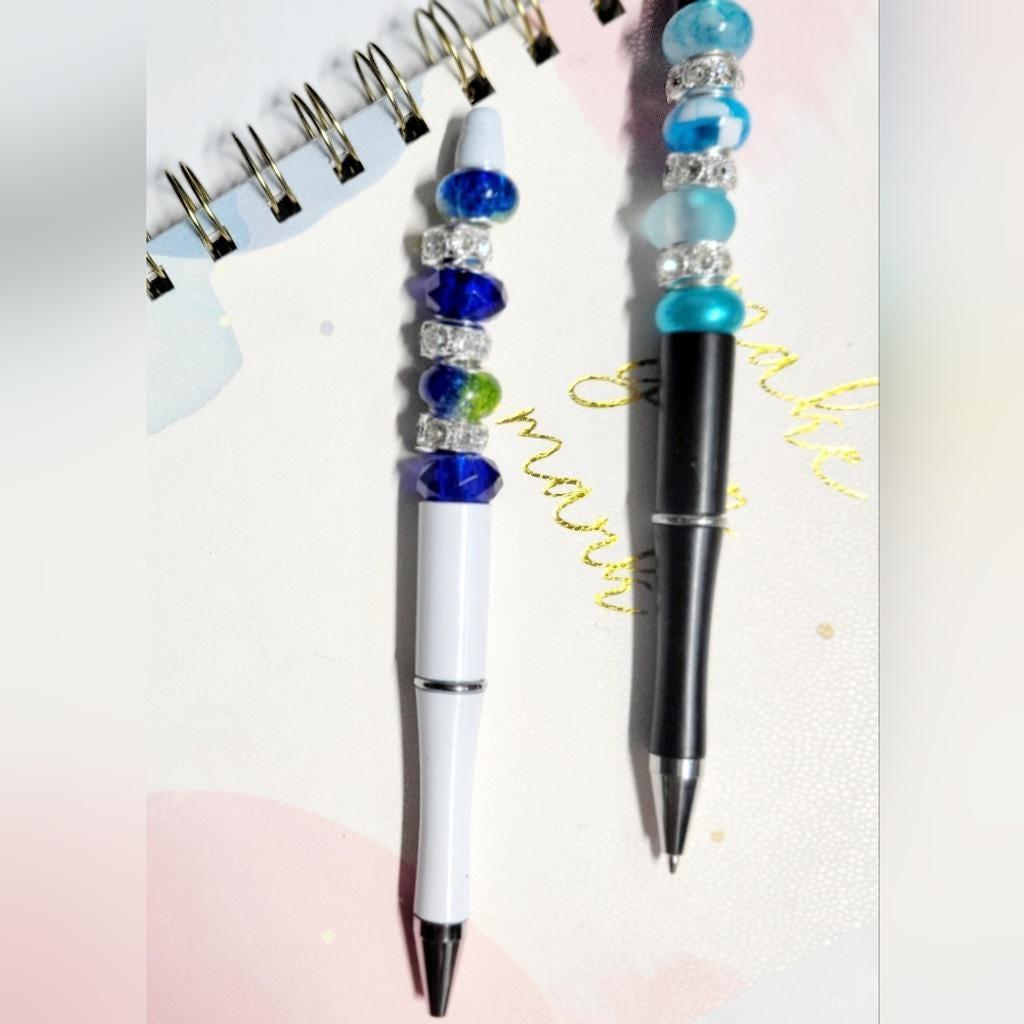 This hand crafted elegant set of 3 beaded pens ate in black, with shades of blue large beads and white rhinestones, white, with green and royal blue beads and white rhinestones, and gold, with red and orange beads and metal spacers. Perfect for adding style to your writing. The ink is black. Notebook not included.