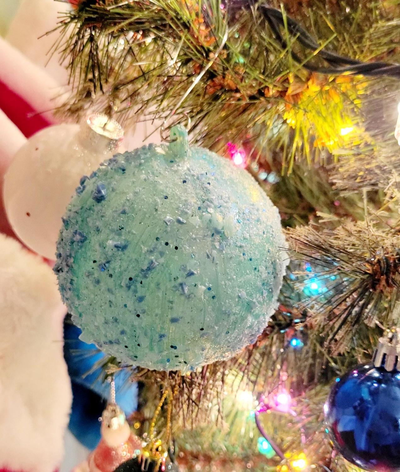 Hand crafted shattered glass ornaments in blues and greens, with jingle bells inside. 2 ornaments are half of each color, with glitter inside. All of the ornaments are covered in various types of glitter to add a sparkle to the ornaments. Each one hangs from a curled ornament hanger. All of the ornaments have been sealed with polycrilic, but there may still be a sharp edge, so please take care while handling. - Handcrafted with premium materials - Shatterproof for safety - Sparkling shattered glass effect - Charming jingle of bells #ChristmasDecor #HolidayOrnaments #ShatterproofGlass #HandcraftedElegance