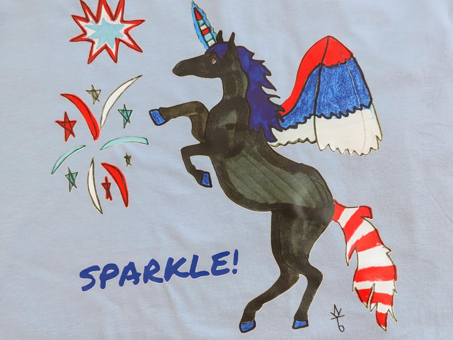 This exclusive designs feature my original art honoring America's Independence Day! Our logo is featured on the back of the shirt.