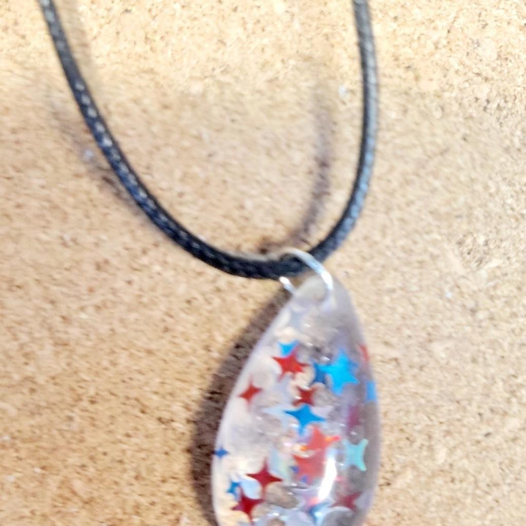 This stunning hand crafted teardrop pendant 18" corded necklace features a captivating design with red and blue star accents set in resin. Perfect for adding a touch of elegance to any outfit.