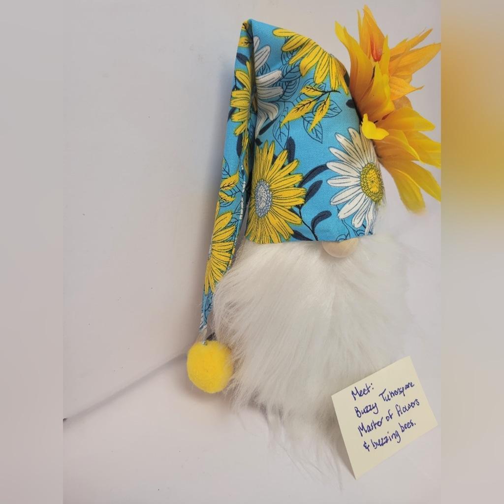 Meet Buzzy Tukerspare, master of flowers, and buzzing bees. Buzzy is handmade with love and made from premium materials. He is weighted with rice and premium poly-fil for stability, has a long white faux fur beard, wooden nose, a bright blue hat with daisy print, and sunflowers with a bumble bee nestled inside. He stands approximately 7" tall and 16" to the tip of his hat. #gnomedecor #sunflower #daisy #homedecor