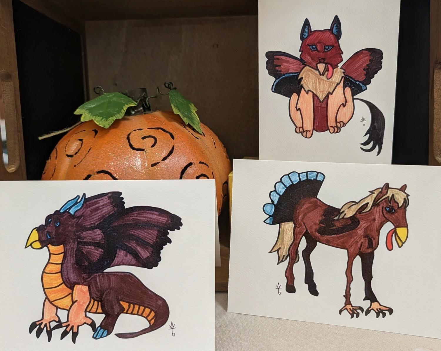 These cards feature original art by autistic artist Ausome Alicorn. The six card set features three different turkey hybrid combinations: horse, wolf, and dragon. You will receive two cards for each design in the set. Singles of each design are also available. If you would like a different combination of designs or quantities, just message us!