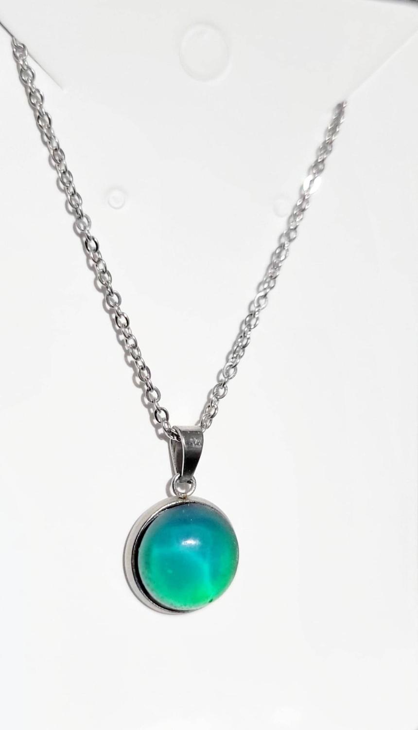 Artisanal made mood boosting comfort necklace. Each necklace features a round, color-changing glass cabochon (approximately 12 mm diameter) set in a stainless steel metal bezel. Comes with a 13" stainless steel chain. Sets of matching earrings and necklace available upon request for $40. Please just message me to create a listing for you.