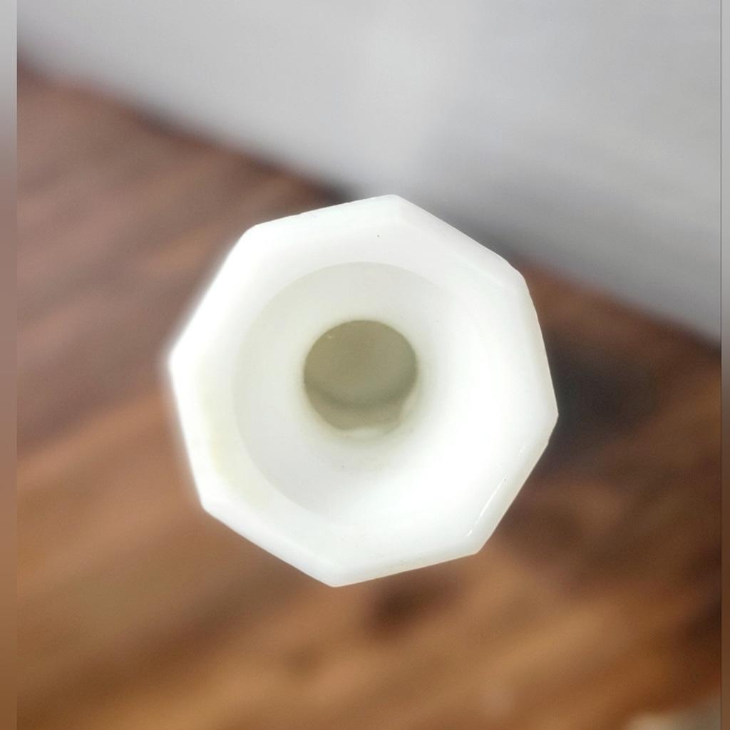 Enhance your home decor with this elegant 9" Hoosier white milk glass bud vase, featuring a starburst pattern. Perfect for adding a touch of sophistication to any room. Flower arrangement not included.