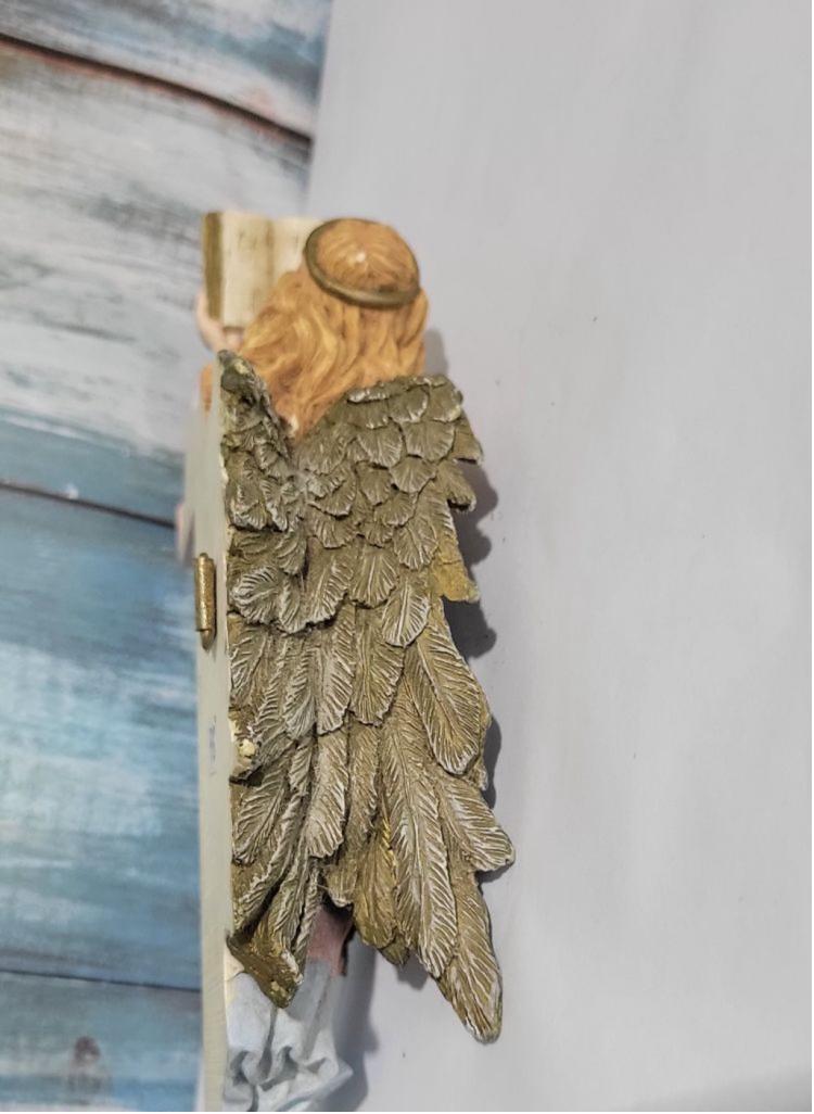This is a pre-owned wall plaque decor featuring an Avon angel figurine plaque. The angel is depicted with long flowing hair, a blue and pink dress, and golden wings. The angel is holding a book in her right hand and has a pink scroll extending from her left hand. The figurine is made of a lightweight material, possibly resin, and is painted in a realistic style. The angel is approximately 10 inches tall and 6 inches wide. The figurine has a metal hook on the back for hanging. The figurine is in good condition with no visible cracks or chips. There is some minor wear and tear on the paint, but this is consistent with its age and use. The figurine is marked "FG" on the back. This would be a lovely addition to any home decor.