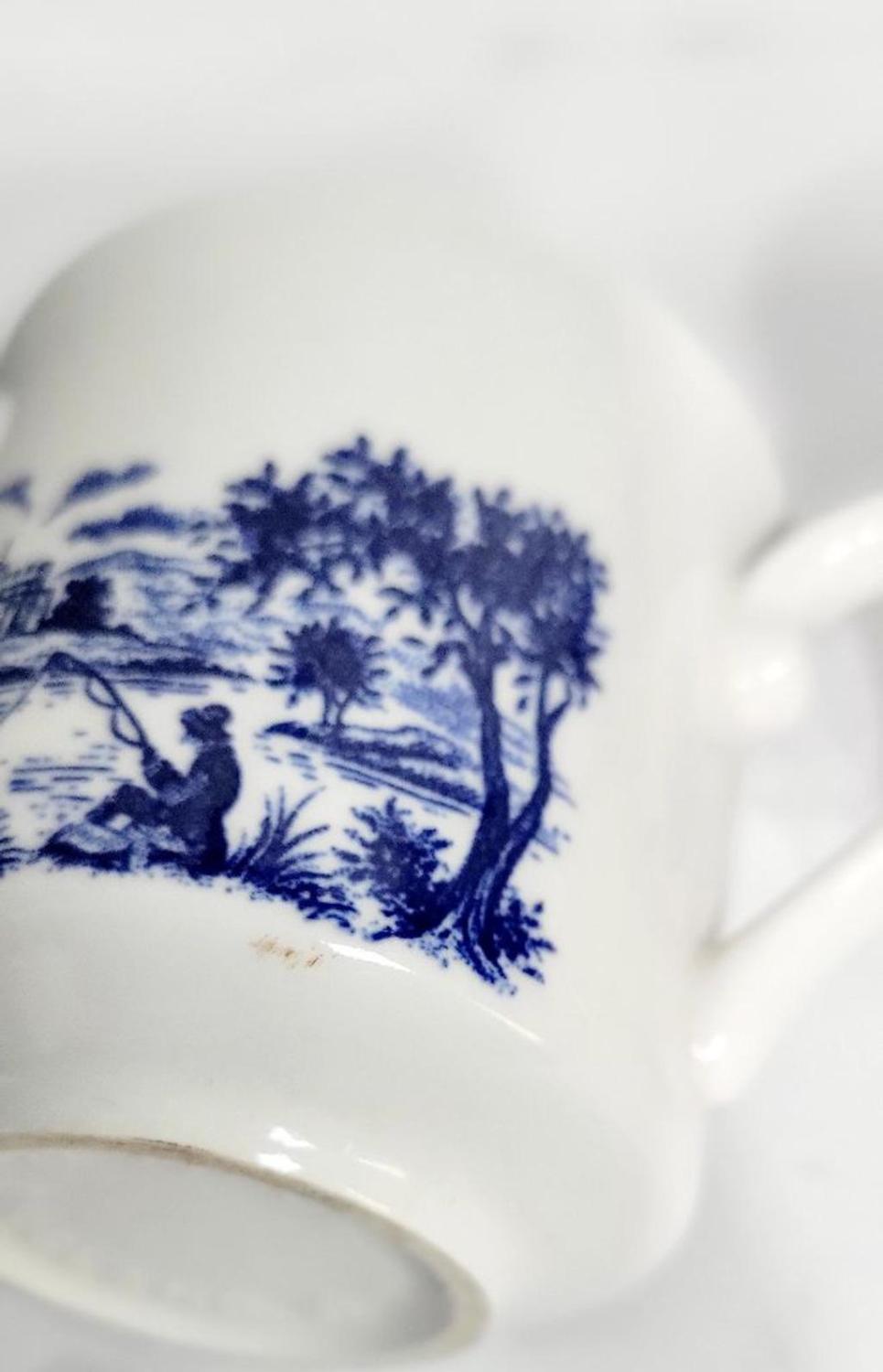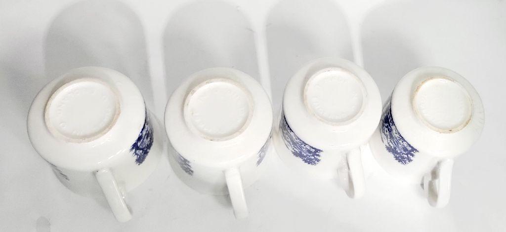 Set of four pre-owned porcelain mugs. Each mug features a blue and white landscape print. They measure approximately 4x3x3 inches. The mugs have a simple, curved handle. Minor imperfections include a small chip on one mug's lip and one handle has been repaired, and a few minor scratches on the surface. The base of each mug is marked 'Made in England'. The overall condition is good, showing signs of previous use due to its age.