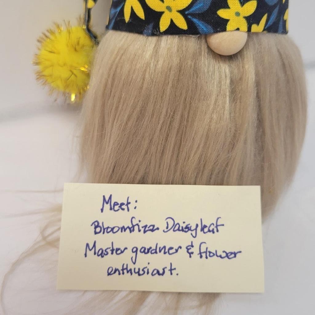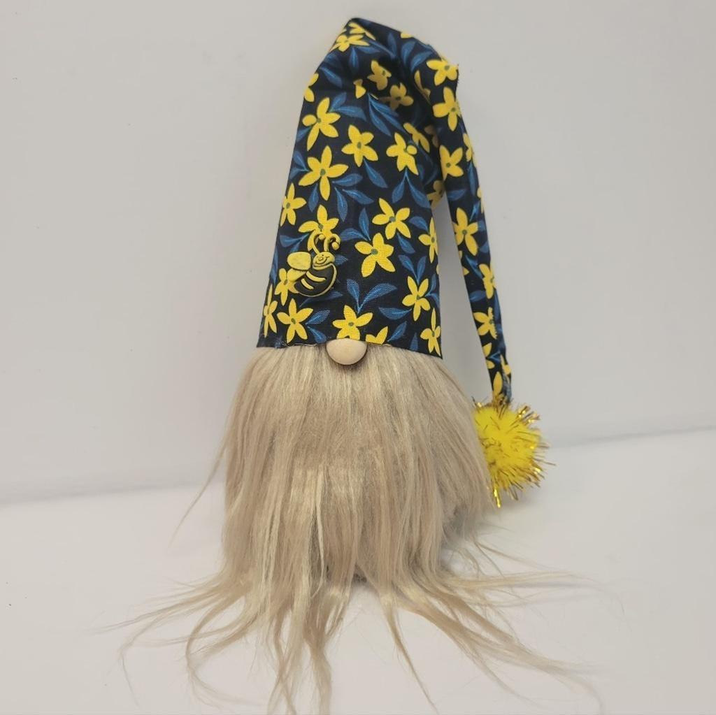 Meet Bloomfizz Daisyleaf, master gardner & flower enthusiast gnome. Bloomfizz is handcrafted with love, made from premium materials. He is weighted with rice and premium poly-fil, has a wooden nose, a long flowing blonde faux fur beard, wearing a long blue and yellow daisy printed hat, with a yellow sparkly pom pom on the tip, and a bumble bee going along for the ride. He stands approximately 8" tall and 16" to the tip of his hat. #gnomedecor #Bumblebee #daisygnome #sunflowergnome